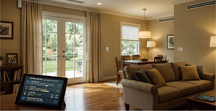 Let the first light of dawn gently wake your bedroom. By the time you return in the evening, soft lighting and the perfect temperature are already waiting to welcome you. From the quiet glide of the curtains and the ambient dimming of lights, to the precise control of climate and ventilation, FATEK seamlessly connects the central nervous system of your entire home.